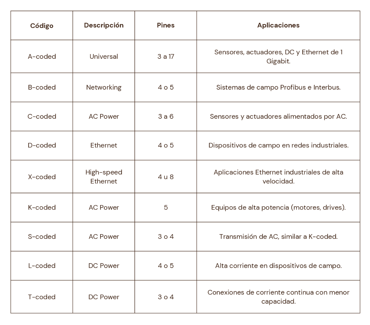 La codificación puede considerarse como el lenguaje que hablan los conectores M12. Cada tipo de codificación, representado por una letra, indica el tipo de señal que el conector puede transportar.